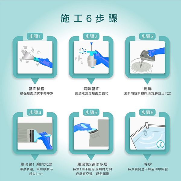 3.施工后保持通風,便于防水層干固;在潮濕環(huán)境中,可能會產(chǎn)生泛白和返堿現(xiàn)象。