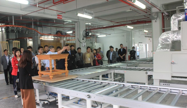 在大寶國際陳賀生董事長的陪同下,陳國都董事長等一行分別對東莞大寶化工安管中心、智能涂裝線、后花園、色板中心、國內市場展廳等進行細致的參觀,陳賀生董事長為大家講解廠區各部分規劃的同時,還與陳國都董事長就產品開發、市場開拓等領域問題進行親切的溝通交流。