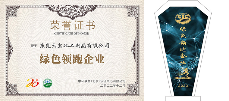 東莞大寶化工制品有限公司榮獲由中環聯合認證中心授予的“綠色領跑企業”榮譽稱號,這是對東莞大寶化工30年來不斷在綠色環保方面追求卓越的最好嘉許。