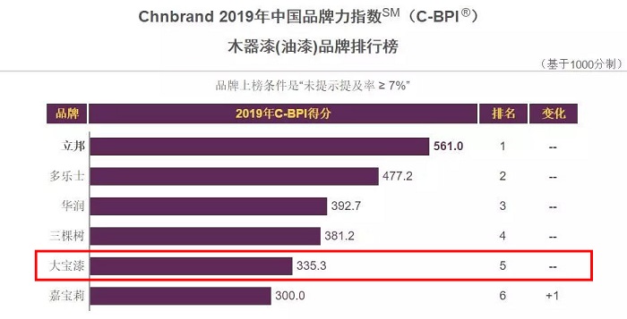 4月15日,由工信部科技司和消費(fèi)品司指導(dǎo),中國領(lǐng)先的品牌評級機(jī)構(gòu)Chnbrand推出的2019年中國品牌力指數(shù)發(fā)布。立邦、多樂士、大寶漆等知名涂料品牌再次上榜。其中,在墻面漆、木器漆的細(xì)分指標(biāo)中,大寶漆品牌都位列前五位。