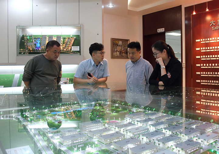 到訪領(lǐng)導(dǎo)一行還參觀了東莞大寶化工現(xiàn)代化的廠房設(shè)備、智能化涂裝線、一流的中央實驗室和展示家具漆產(chǎn)品完美施工效果的色板中心等地,增進了彼此的了解和進一步合作的信心。針對“油改水”問題,工作人員向參訪人員介紹了大寶漆水性漆的工藝和質(zhì)量控制情況,詳細回答了馬總、李總一行對智能涂裝線的提問。考察人員對大寶漆先進的生產(chǎn)管理和環(huán)保理念給予了高度評價。