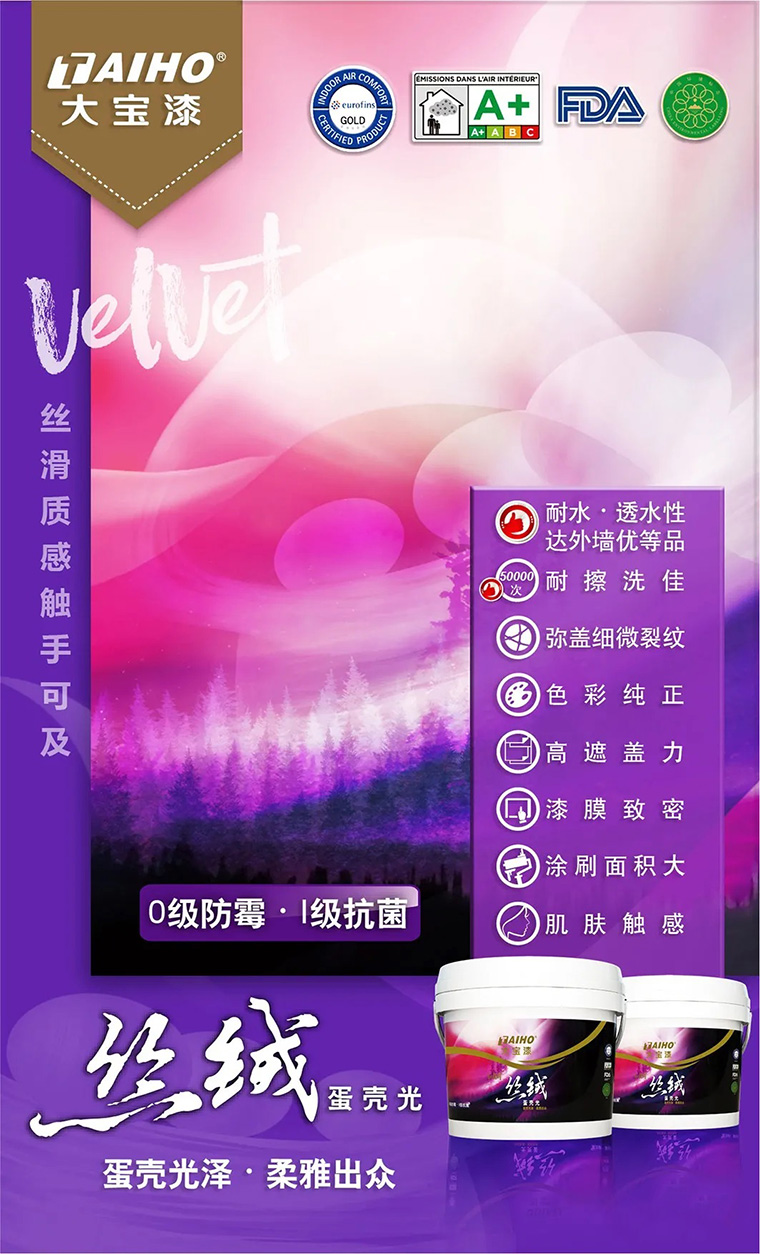 大寶絲絨蛋殼光親膚觸感,給家全新視覺體驗。采用國際品牌優(yōu)質(zhì)原料,結(jié)合凈味技術(shù)和創(chuàng)新『肌膚觸感墻面體驗』及獨(dú)特的工藝精心研制。涂刷后墻面呈現(xiàn)絲絨般光澤,不反光的柔雅質(zhì)感,同時漆膜致密飽滿、親膚觸感與視覺效果完美統(tǒng)一,同時符合多項國際環(huán)保認(rèn)證,為家打造全新的視覺盛宴和居家體驗。